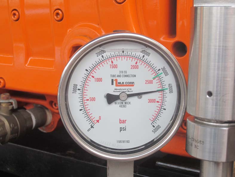 (下圖一:設(shè)備現(xiàn)場(chǎng)演示;下圖二:設(shè)備的性能穩(wěn)定,最高壓力達(dá)到2800bar,流量47Lpm)